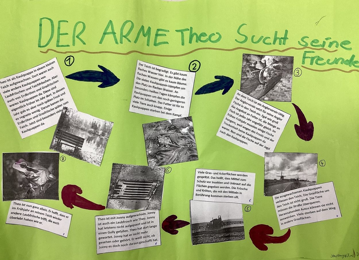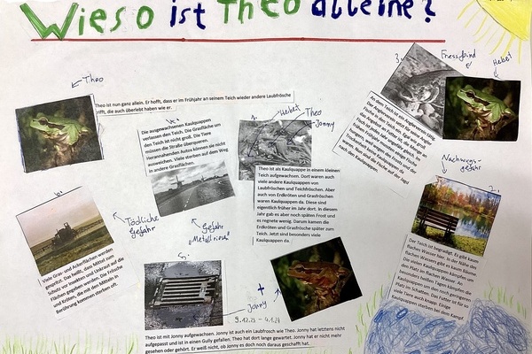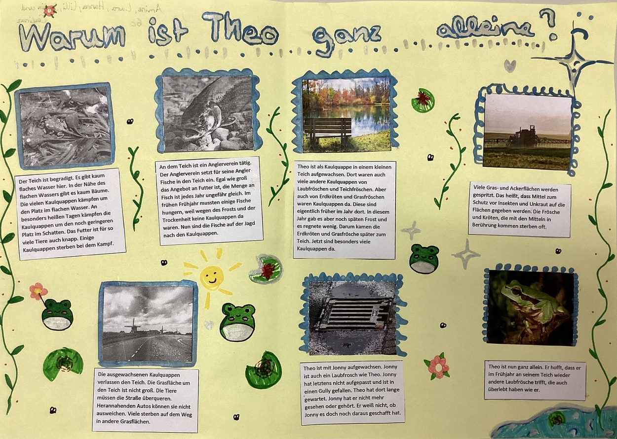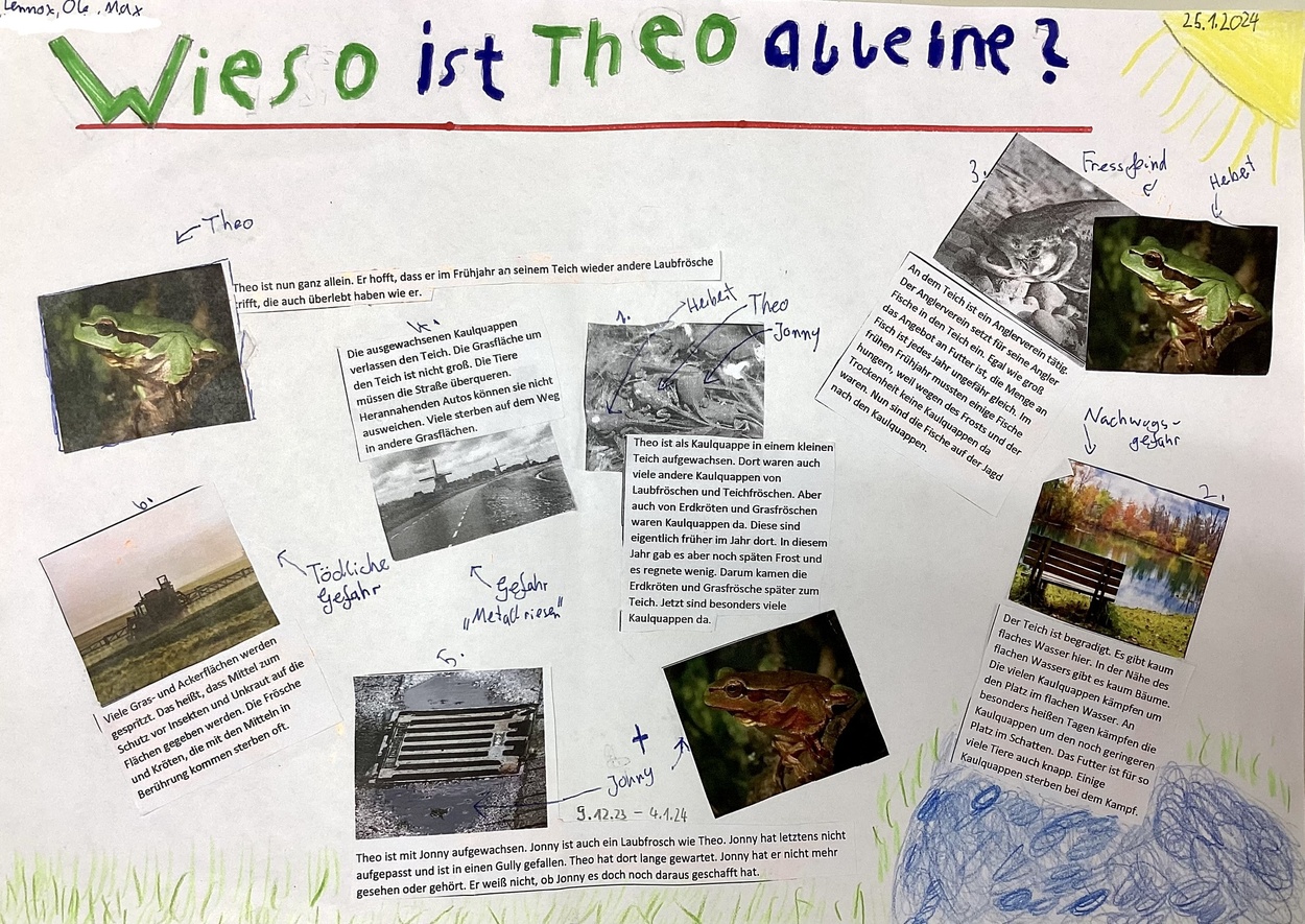 Anhand von Theo, einem kleinen Frosch, der in einem kleinen Teich geboren wurde, lernten die Schüler*innen weitere Gefahren kennen, welche Theo auf seinem Lebensweg allgemein aber auch bei der Amphibienwanderung begegnen können. Dazu gehören z.B. begradigte Flüsse (und dadurch stillgelegte Teiche), mit Gift bespritzte Ackerflächen, zu überquerende Straßen oder Gullydeckel. Die Plakate über Theo und seinen Freund Johnny, vom dem Theo nach Johnnys Sturz durch einen Gullydeckel nicht weiß, wie es ihm geht, wurden anschließend mit großer Begeisterung präsentiert.