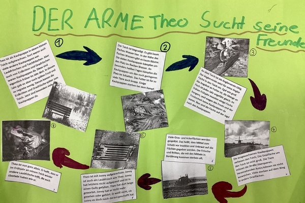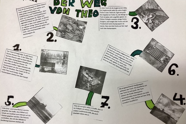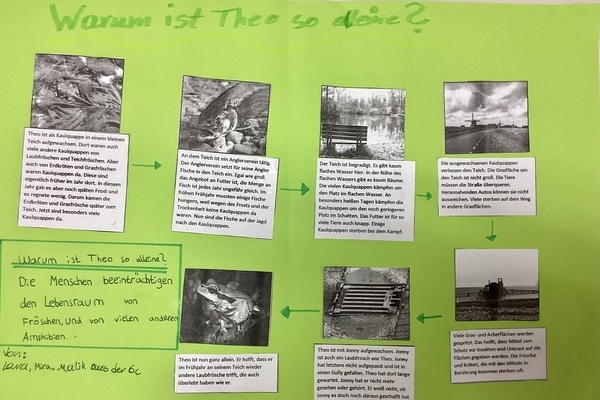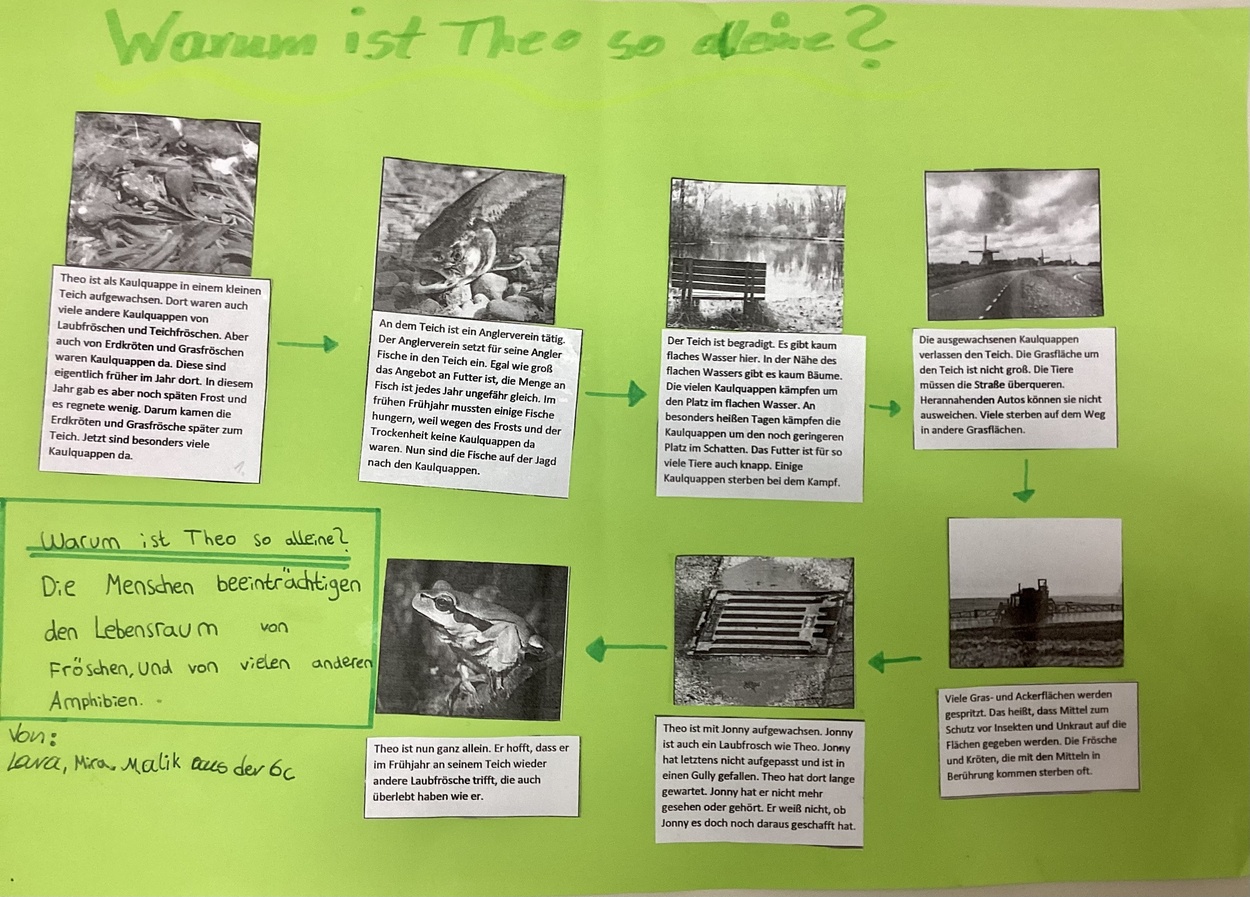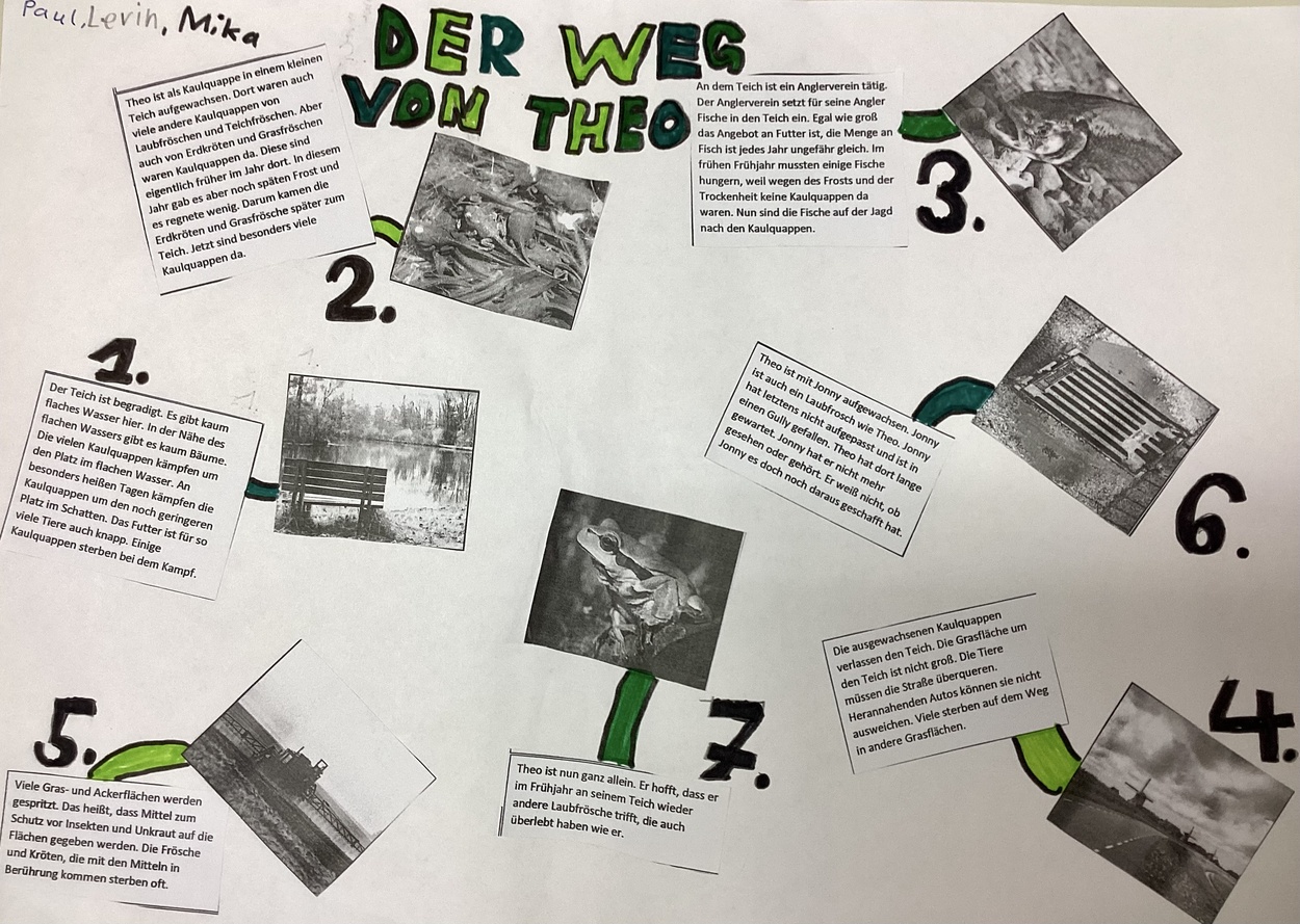 Anhand von Theo, einem kleinen Frosch, der in einem kleinen Teich geboren wurde, lernten die Schüler*innen weitere Gefahren kennen, welche Theo auf seinem Lebensweg allgemein aber auch bei der Amphibienwanderung begegnen können. Dazu gehören z.B. begradigte Flüsse (und dadurch stillgelegte Teiche), mit Gift bespritzte Ackerflächen, zu überquerende Straßen oder Gullydeckel. Die Plakate über Theo und seinen Freund Johnny, vom dem Theo nach Johnnys Sturz durch einen Gullydeckel nicht weiß, wie es ihm geht, wurden anschließend mit großer Begeisterung präsentiert.