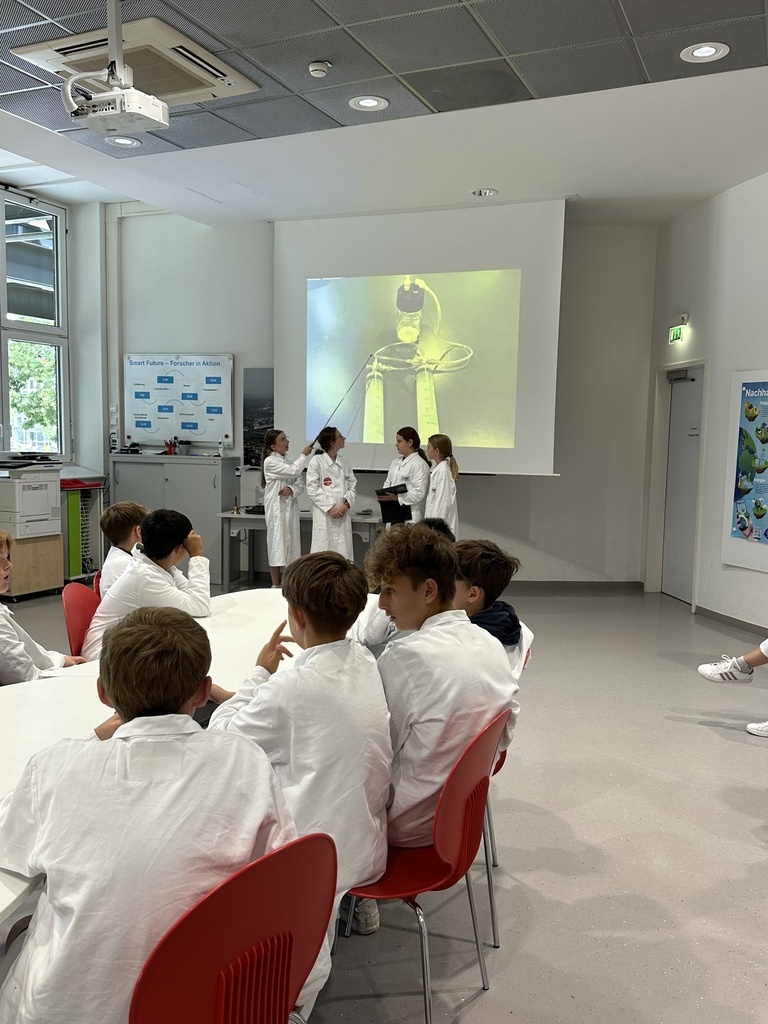 Bei der Durchführung der Experimente arbeiten die Schüler*innen hauptsächlich eigenverantwortlich. Sie lesen sich die Anleitungen für die Experimente auf den iPads durch, holen sich das entsprechende Material, führen die Experimente durch und machen Bilder und Videos zur Dokumentation. Abschließend präsentierten die Gruppen – stolz in weißen Laborkitteln – am iPad ihre Experimente mitsamt ihren Ergebnissen.