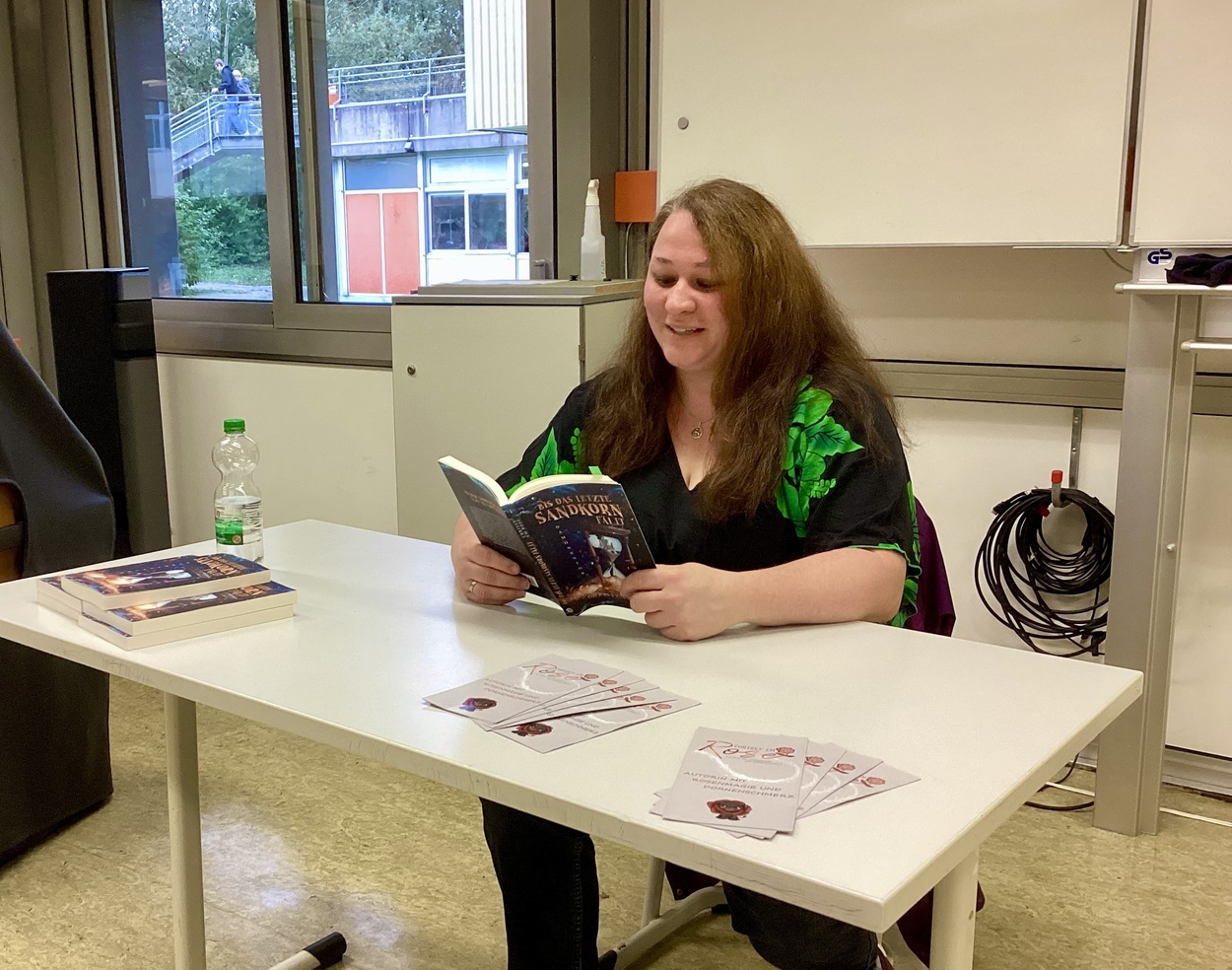 Schnell hatte die Autorin die Schüler*innen für den Plot begeistert, ehe sie in einer Lesepause Fragen zu sich und dem Werdegang einer Self-Publishing-Autorin beantwortete. „Ein bisschen Chrissy“ stecke in all ihren Protagonisten, so auch in der zielstrebigen Malia, die wie die Autorin selbstbewusst ihren Weg geht. Obwohl sie selbst keine sehr gute Schülerin gewesen sei, habe sie schon im selben Alter wie ihr Publikum mit dem Schreiben begonnen – Lernwilligkeit und Fantasie seien Schlüsselfertigkeiten in diesem Beruf, nicht nur das Schreiben selbst, ermunterte sie die Schüler*innen. Chrissy Em Rose, gelernte Hotelfachfrau, heißt eigentlich Christiane Schmitt. Die Inspiration zu ihrem Pseudonym kam über ihre Nichten, die Emely und Marie heißen (Em).