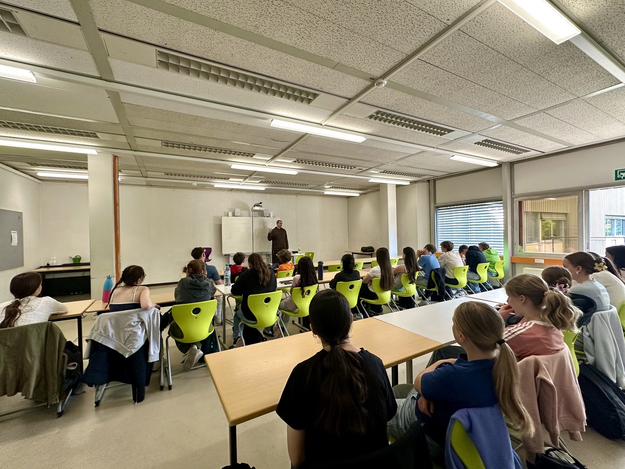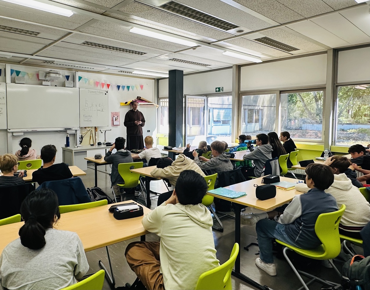 Besonders interessiert zeigten sich die Klassen bei den praktischen Einblicken: Wie lebt ein Mönch heute? Wie sieht sein Tagesablauf aus? Und warum entscheidet sich ein Mensch überhaupt, diesen Weg zu gehen? Seine Antwort: aus dem Wunsch, mit schwierigen Themen besser umgehen zu lernen und ein tieferes Gemeinschaftsgefühl zu erleben. Dass dabei auch äußere Merkmale wie das Rasieren der Haare eine Rolle spielen, stieß auf neugieriges Nachfragen – besonders als klar wurde, dass auch buddhistische Nonnen diesen Brauch teilen.