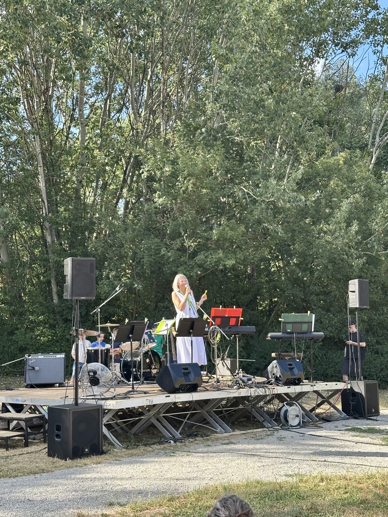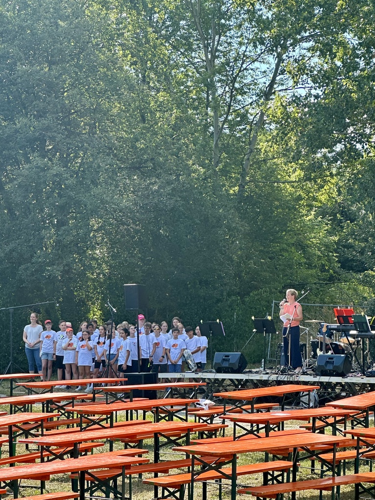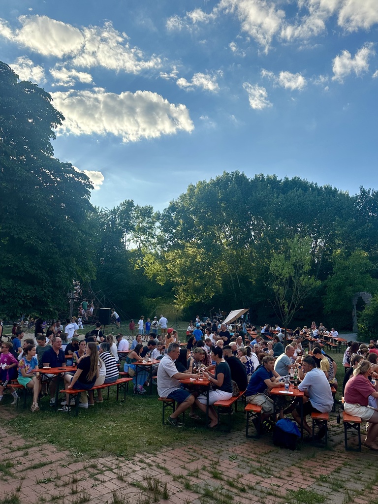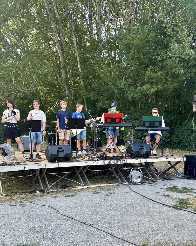Zu Beginn hielten sich die meisten Besucher*innen noch in den schattigen Bereichen unter den Bäumen auf, doch mit der sinkenden Sonne füllten sich nach und nach auch die Tische direkt vor der Bühne. Dort gab es den Abend über ein vielseitiges Programm: Nach einem musikalischen Auftakt durch den 6k-United Chor sorgte die Schülerband unter der Leitung von Herrn Shareski für eine gute Stimmung. „Das ist ja wie im Urlaub hier“ hörte man an diesem Abend nicht nur einmal.