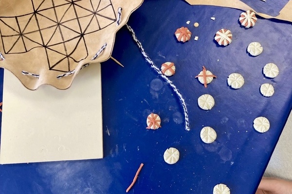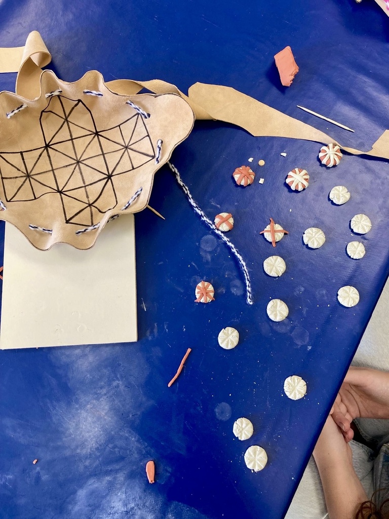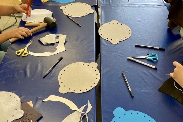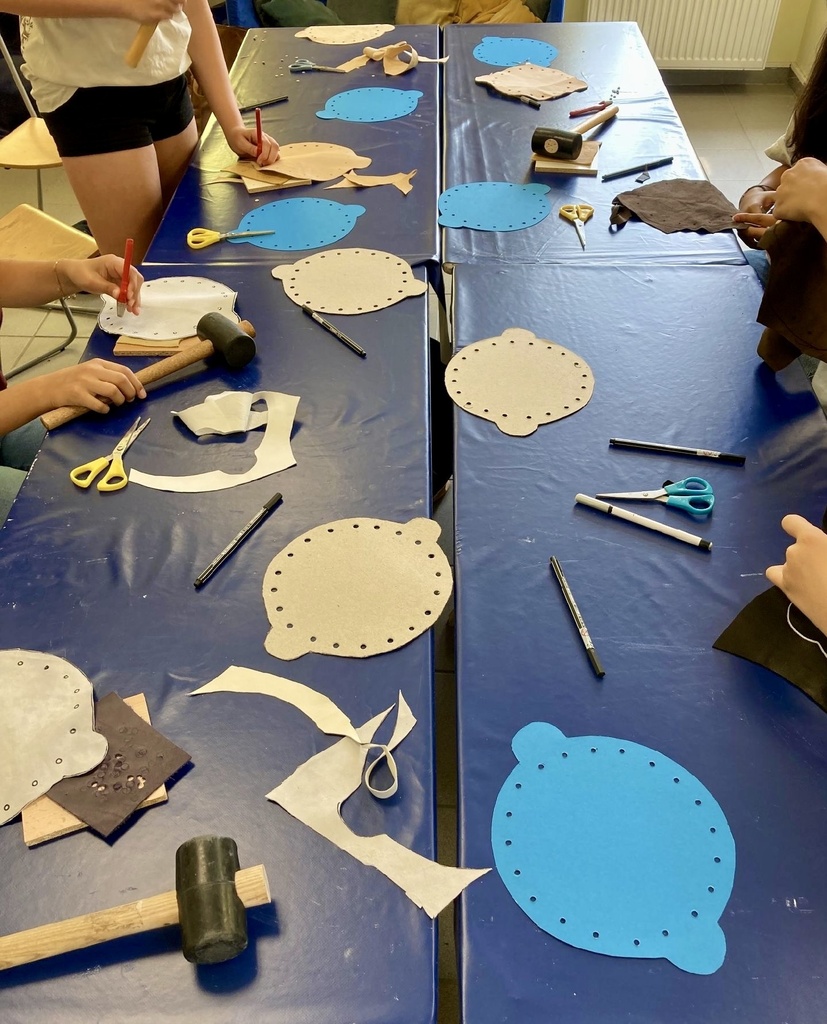 Im Anschluss stand praktisches Arbeiten auf dem Programm: Es galt, ein Reisespiel in einem Lederbeutel selbst herzustellen. Mit viel Engagement wurden Spielfelder auf Leder gezeichnet, das Material zugeschnitten und gestanzt – eine durchaus anspruchsvolle Aufgabe – und schließlich Kordeln gefertigt. Am Ende hielten alle stolz ihr selbstgemachtes Spiel in den Händen – perfekt ausgerüstet für die anstehenden Ferien!