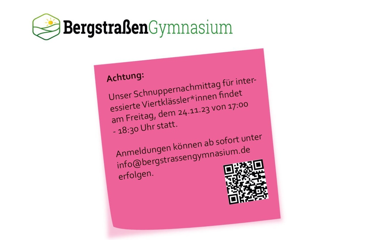 Bitte melden Sie sich unter info@bergstrassengymnasium.de an. Wir freuen uns auf Sie und Ihre Kinder!