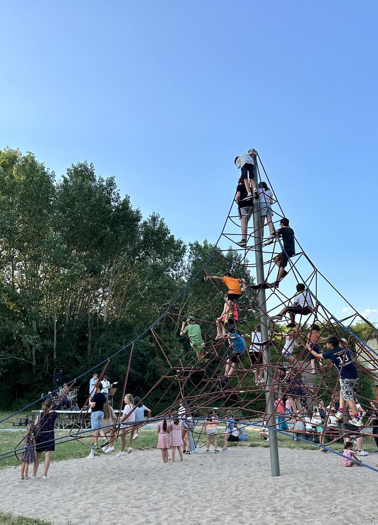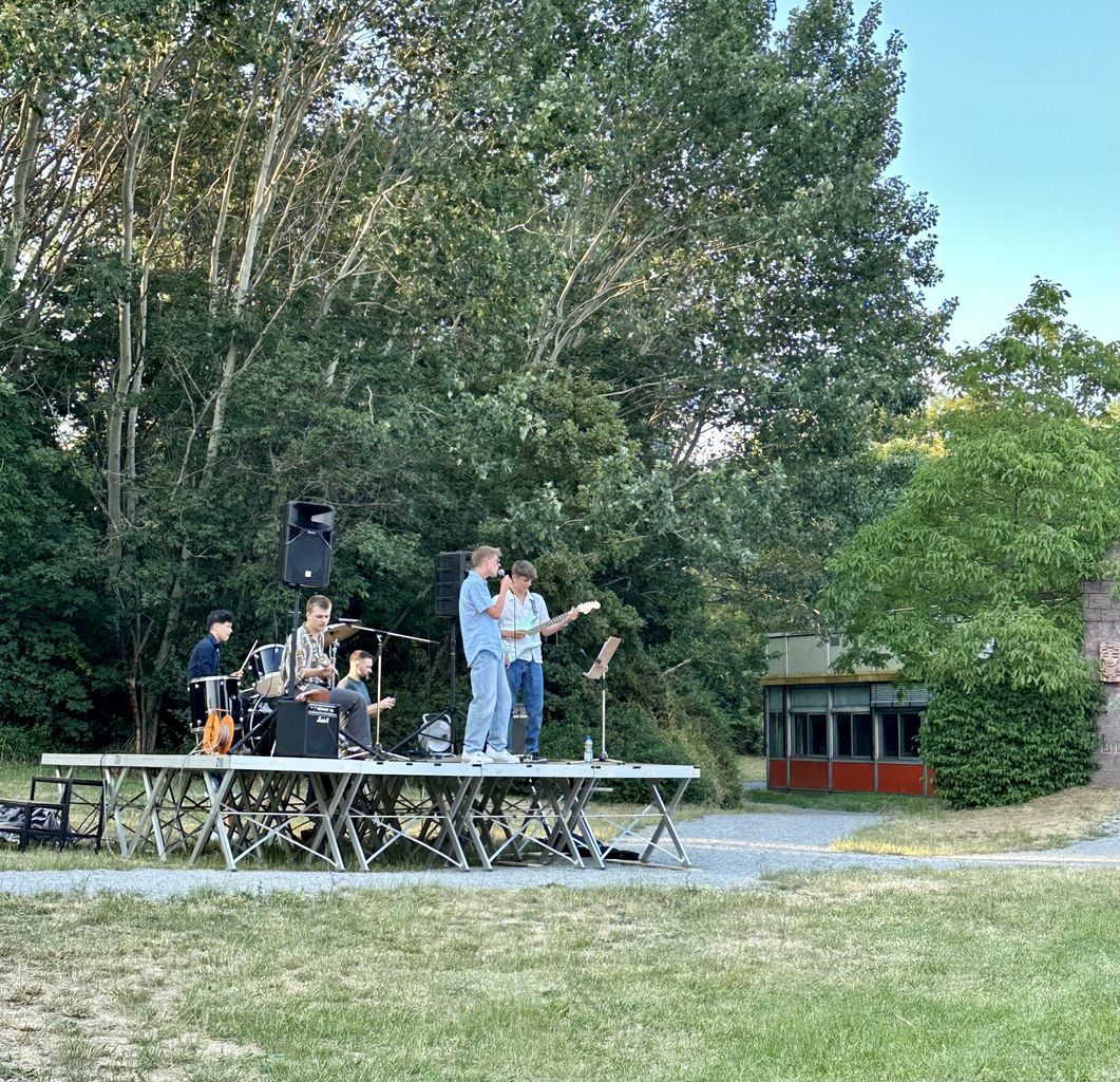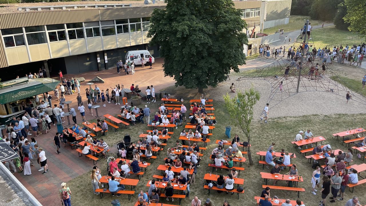 Das Sommerfest war eine schöne Gelegenheit zum Austausch zwischen Schüler*innen, Lehrer*innen und den Eltern sowie allen am Schulleben Beteiligten. Während die Läufer*innen (teilweise über zwei Stunden lang) ihre Runden liefen, konnte man sich – als Pause oder zur Stärkung – mit Essen und Trinken an die auf dem Schulgelände aufgestellten Tische setzen und angeregte Gespräche führen oder der Schülerband lauschen. Auch die Läufer*innen nahmen die Angebote nach ihrem sportlichen