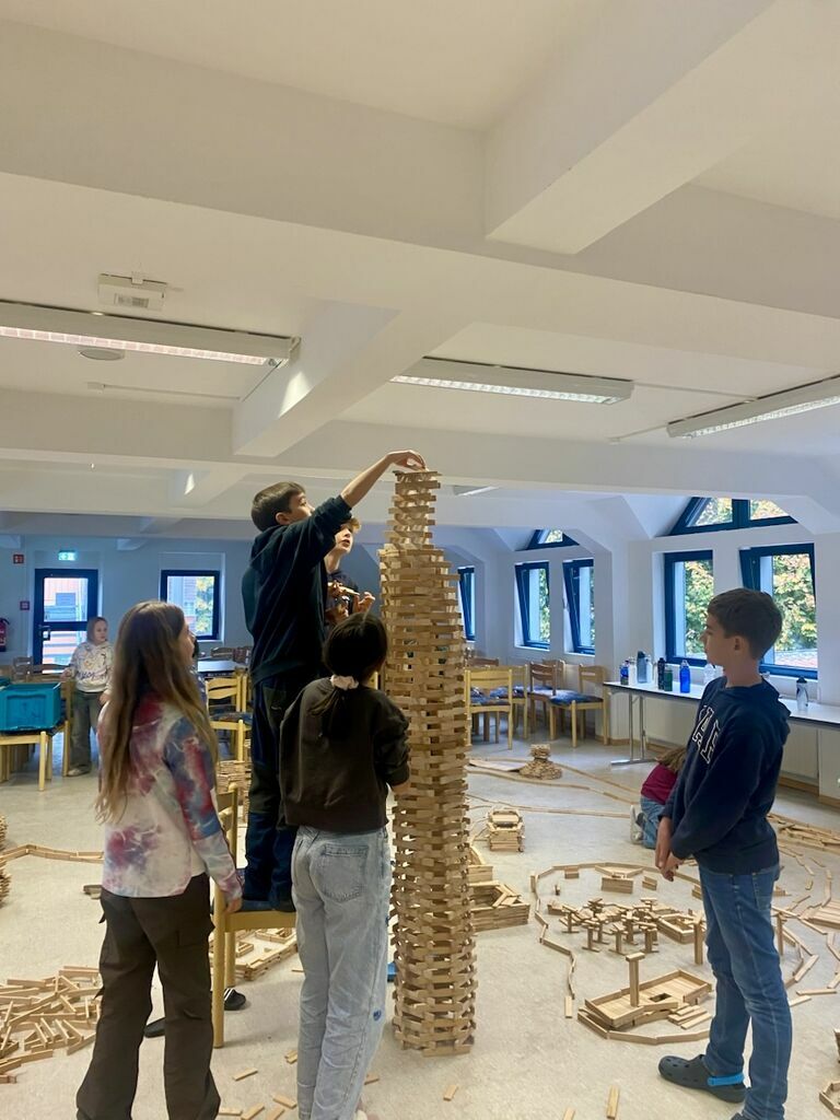 Auch beim Städtebauen aus Bauklötzen zeigte die Klasse viel Teamgeist und konnte ihre Kreativität ausleben und gemeinsam etwas Großes erschaffen. Da machte es auch nichts aus, dass der riesige Turm während des Bauens einmal in sich zusammenfiel. Die Kinder bauten ihn in Windeseile wieder auf – gemeinsam war das überhaupt kein Problem.